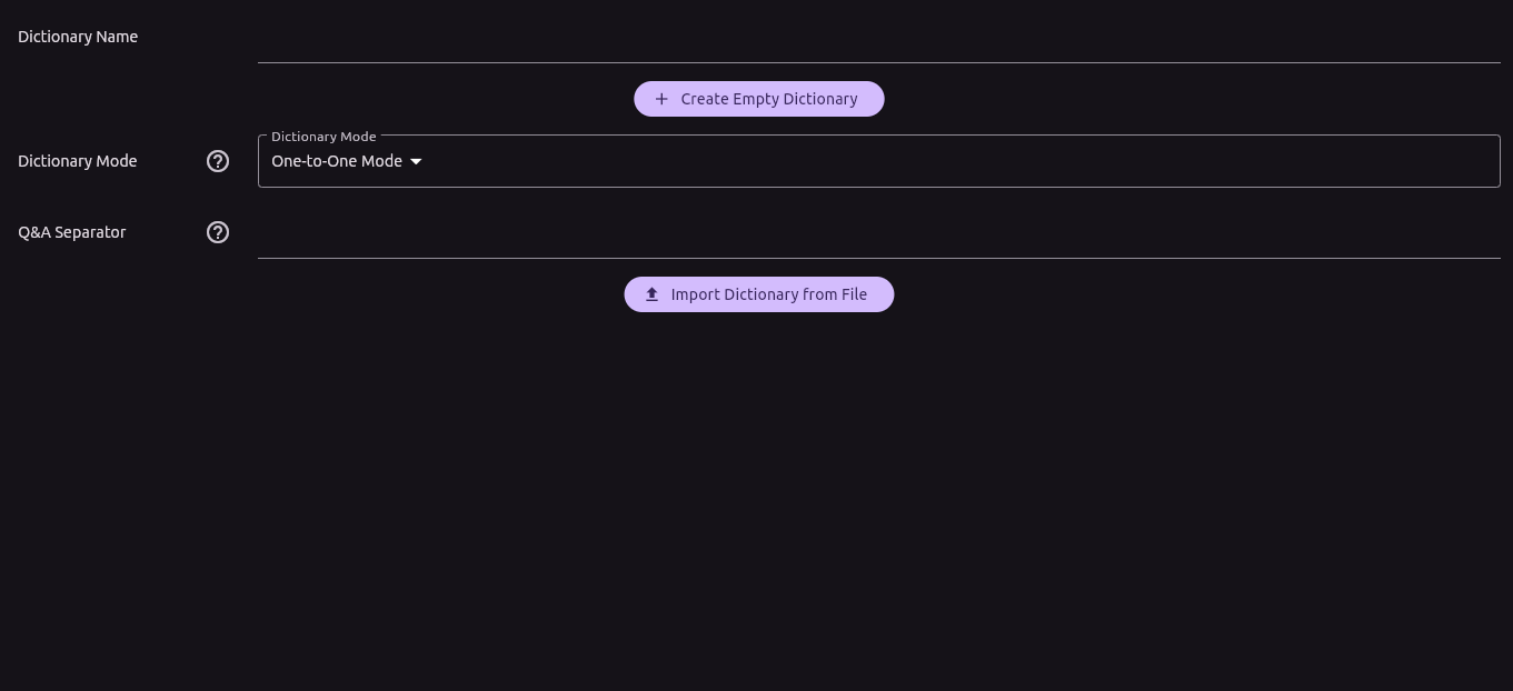 - Import Dictionary From File: You can create a dictionary by importing a file containing questions and answers. Each line in the file must contain one question and its corresponding answer, separated by a globally unique separator (known as the Q&A separator).