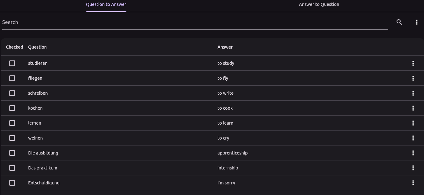 The Edit Page allows you to manage your dictionary entries. You can edit questions and answers, check or uncheck them, create new entries, delete existing ones, and search through your entries.